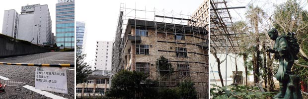 さて、この歴史ある小学校はやがて児童数の減少により、1991年に桜田小学校などとともに御成門小学校に統合され廃校となった。1971年築の建物は、その後も港区エコプラザなど区の施設に利用されてきたが、ついに取り壊しが決まり、2010年に入って解体工事が本格化している(写真上中)。まだ校庭にはおなじみの二宮金次郎像が残り、傍らにはつぶれて朽ち果てようとする百葉箱があったが、たぶん、あっという間にきれいさっぱり消えて無くなってしまうことだろう。貴重な歴史をどう伝えていくかが気になるところである。